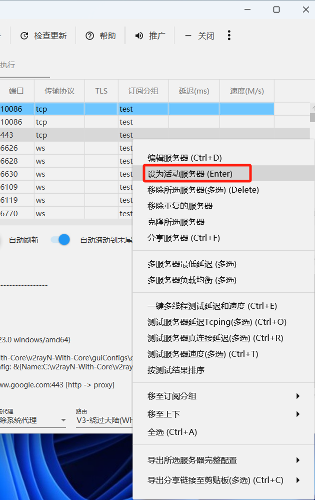订阅添加并更新完成后,可在节点列表中右键点击要使用的节点,右键菜单中点【设为活动的服务器(Enter)】或回车,即可选择该节点,如下图所示:
